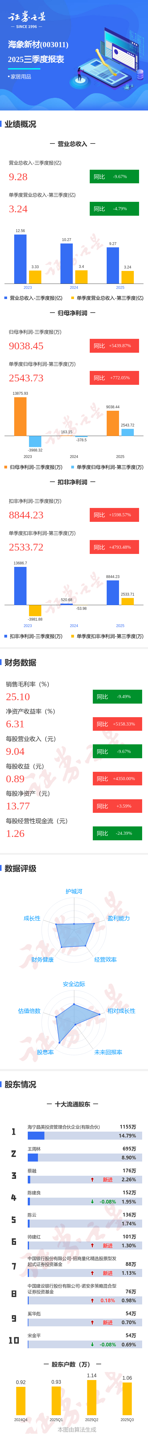 证券之星消息,海象新材2025年三季报显示,前三季度公司主营收入9.28亿元,同比下降9.68%;归母净利润9038.45万元,同比上升5439.87%;扣非净利润8844.23万元,同比上升1598.58%;其中2025年第三季度,公司单季度主营收入3.24亿元,同比下降4.79%;单季度归母净利润2543.73万元,同比上升772.05%;单季度扣非净利润2533.72万元,同比上升4793.48%;负债率34.25%,投资收益9.49万元,财务费用-175.87万元,毛利率25.1%。
