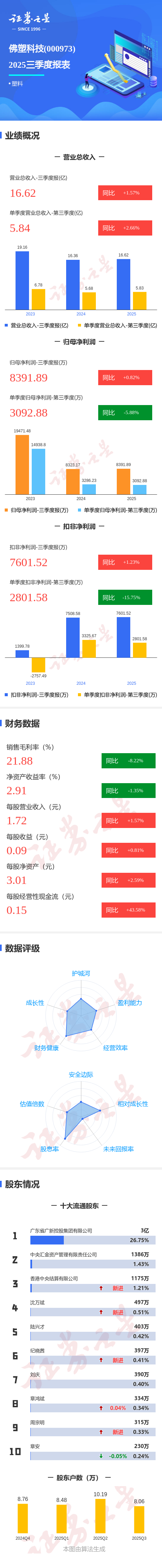 证券之星消息,佛塑科技2025年三季报显示,前三季度公司主营收入16.62亿元,同比上升1.57%;归母净利润8391.89万元,同比上升0.83%;扣非净利润7601.52万元,同比上升1.24%;其中2025年第三季度,公司单季度主营收入5.84亿元,同比上升2.66%;单季度归母净利润3092.88万元,同比下降5.88%;单季度扣非净利润2801.58万元,同比下降15.76%;负债率29.58%,投资收益3262.61万元,财务费用1664.7万元,毛利率21.88%。