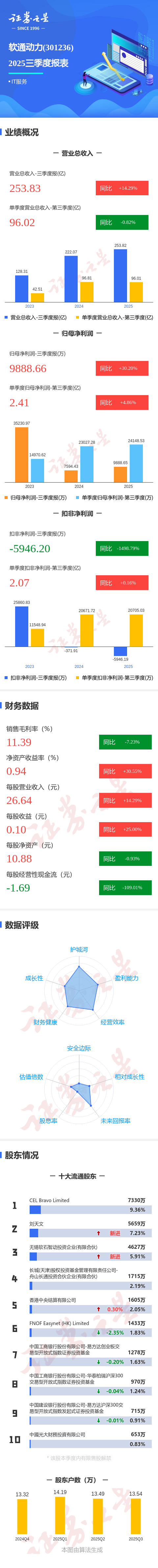 证券之星消息,软通动力2025年三季报显示,前三季度公司主营收入253.83亿元,同比上升14.3%;归母净利润9888.66万元,同比上升30.21%;扣非净利润-5946.2万元,同比下降1498.79%;其中2025年第三季度,公司单季度主营收入96.02亿元,同比下降0.83%;单季度归母净利润2.41亿元,同比上升4.87%;单季度扣非净利润2.07亿元,同比上升0.16%;负债率60.64%,投资收益-572.82万元,财务费用9974.81万元,毛利率11.39%。