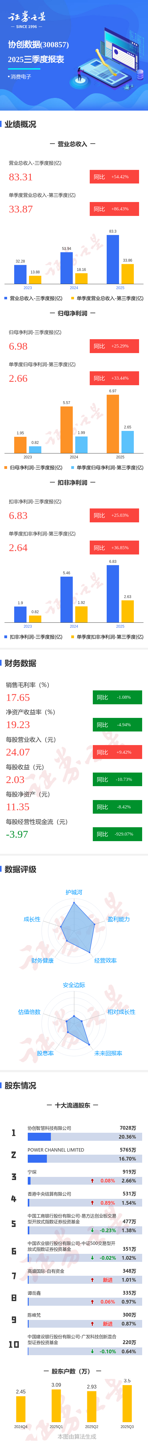 证券之星消息,协创数据2025年三季报显示,前三季度公司主营收入83.31亿元,同比上升54.43%;归母净利润6.98亿元,同比上升25.3%;扣非净利润6.83亿元,同比上升25.03%;其中2025年第三季度,公司单季度主营收入33.87亿元,同比上升86.43%;单季度归母净利润2.66亿元,同比上升33.44%;单季度扣非净利润2.64亿元,同比上升36.86%;负债率78.33%,投资收益343.14万元,财务费用1.78亿元,毛利率17.65%。