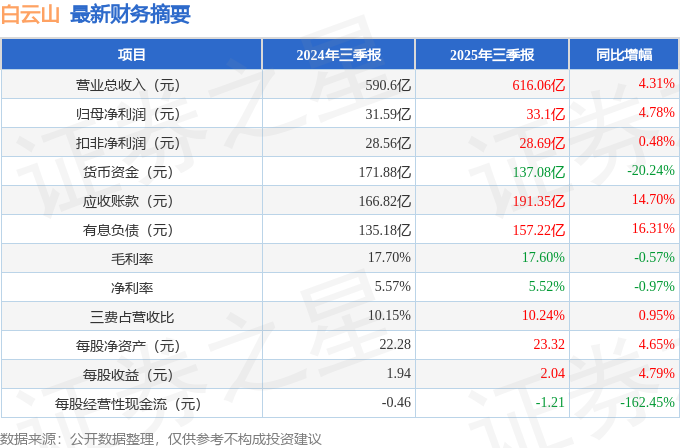 据证券之星公开数据整理,近期白云山(600332)发布2025年三季报。根据财报显示,白云山营收净利润同比双双增长。截至本报告期末,公司营业总收入616.06亿元,同比上升4.31%,归母净利润33.1亿元,同比上升4.78%。按单季度数据看,第三季度营业总收入197.71亿元,同比上升9.74%,第三季度归母净利润7.94亿元,同比上升30.28%。