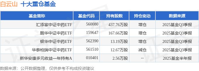 持有白云山最多的基金为汇添富中证中药ETF,目前规模为24.89亿元,最新净值1.0768(10月29日),较上一交易日上涨0.47%,近一年下跌5.84%。该基金现任基金经理为过蓓蓓。