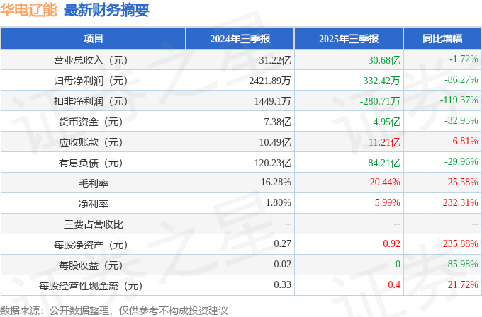 据证券之星公开数据整理,近期华电辽能(600396)发布2025年三季报。截至本报告期末,公司营业总收入30.68亿元,同比下降1.72%,归母净利润332.42万元,同比下降86.27%。按单季度数据看,第三季度营业总收入10.44亿元,同比上升6.61%,第三季度归母净利润-8276.56万元,同比上升13.88%。本报告期华电辽能短期债务压力上升,流动比率达0.42。