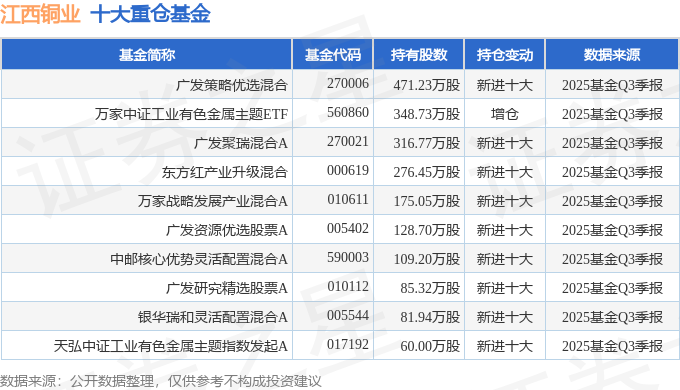 持有江西铜业最多的基金为广发策略优选混合,目前规模为28.9亿元,最新净值2.8684(10月29日),较上一交易日上涨2.55%,近一年上涨20.01%。该基金现任基金经理为罗洋。
