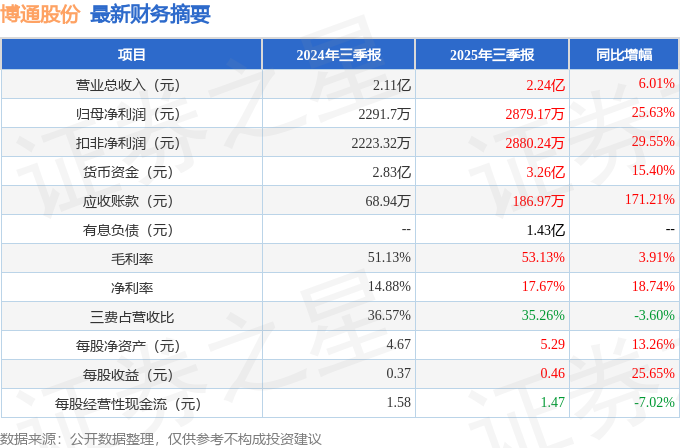 据证券之星公开数据整理,近期博通股份(600455)发布2025年三季报。截至本报告期末,公司营业总收入2.24亿元,同比上升6.01%,归母净利润2879.17万元,同比上升25.63%。按单季度数据看,第三季度营业总收入7537.76万元,同比上升7.59%,第三季度归母净利润1545.88万元,同比上升13.75%。本报告期博通股份盈利能力上升,毛利率同比增幅3.91%,净利率同比增幅18.74%。
