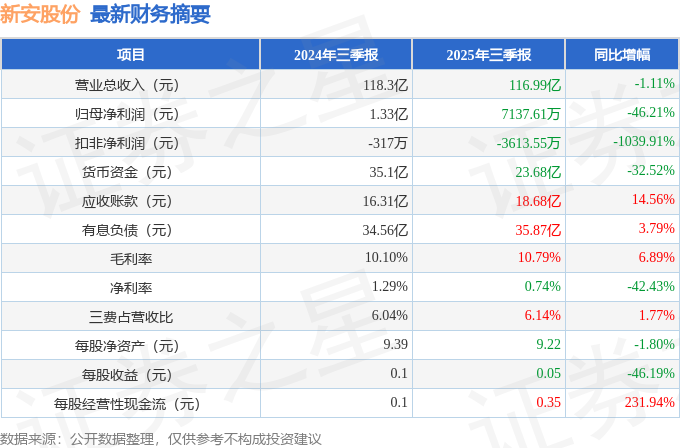 据证券之星公开数据整理,近期新安股份(600596)发布2025年三季报。截至本报告期末,公司营业总收入116.99亿元,同比下降1.11%,归母净利润7137.61万元,同比下降46.21%。按单季度数据看,第三季度营业总收入36.41亿元,同比上升8.97%,第三季度归母净利润230.27万元,同比上升276.65%。本报告期新安股份公司应收账款体量较大,当期应收账款占最新年报归母净利润比达3634.54%。