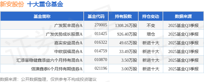 持有新安股份最多的基金为广发聚丰混合A,目前规模为33.66亿元,最新净值0.6822(10月29日),较上一交易日上涨2.51%,近一年上涨28.6%。该基金现任基金经理为苏文杰。