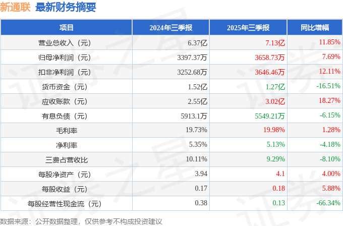 据证券之星公开数据整理,近期新通联(603022)发布2025年三季报。截至本报告期末,公司营业总收入7.13亿元,同比上升11.85%,归母净利润3658.73万元,同比上升7.69%。按单季度数据看,第三季度营业总收入2.57亿元,同比上升22.95%,第三季度归母净利润1491.99万元,同比上升13.56%。本报告期新通联公司应收账款体量较大,当期应收账款占最新年报归母净利润比达605.72%。