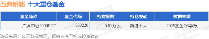 持有西典新能最多的基金为广发中证2000ETF,目前规模为0.66亿元,最新净值1.467(10月29日),较上一交易日下跌0.11%,近一年上涨39.06%。该基金现任基金经理为夏浩洋。