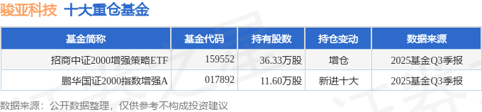 持有骏亚科技最多的基金为招商中证2000增强策略ETF,目前规模为5.4亿元,最新净值2.0341(10月29日),较上一交易日下跌0.12%,近一年上涨63.2%。该基金现任基金经理为邓童。