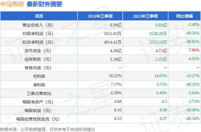 据证券之星公开数据整理,近期中马传动(603767)发布2025年三季报。截至本报告期末,公司营业总收入6.82亿元,同比下降2.4%,归母净利润2528.28万元,同比下降49.56%。按单季度数据看,第三季度营业总收入2.4亿元,同比上升15.23%,第三季度归母净利润1363.21万元,同比上升25.76%。本报告期中马传动公司应收账款体量较大,当期应收账款占最新年报归母净利润比达668.72%。