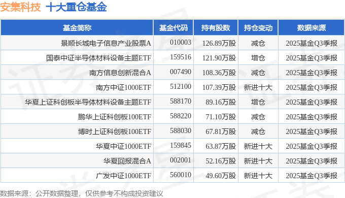 持有安集科技最多的基金为景顺长城电子信息产业股票A,目前规模为15.72亿元,最新净值1.6641(10月29日),较上一交易日上涨0.34%,近一年上涨45.3%。该基金现任基金经理为杨锐文。