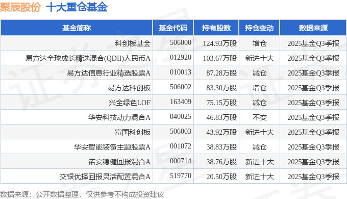 持有聚辰股份最多的基金为科创板基金,目前规模为24.48亿元,最新净值1.1668(10月29日),较上一交易日上涨0.36%,近一年上涨55.45%。该基金现任基金经理为郑晓曦。