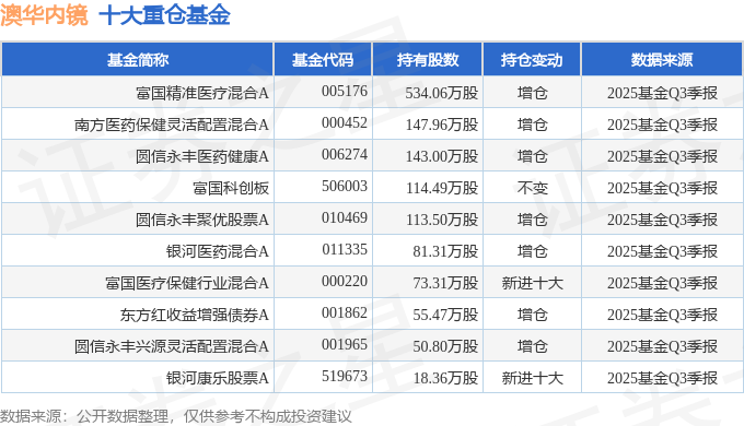 持有澳华内镜最多的基金为富国精准医疗混合A,目前规模为34.91亿元,最新净值3.2204(10月29日),较上一交易日下跌1.82%,近一年上涨33.55%。该基金现任基金经理为赵伟。