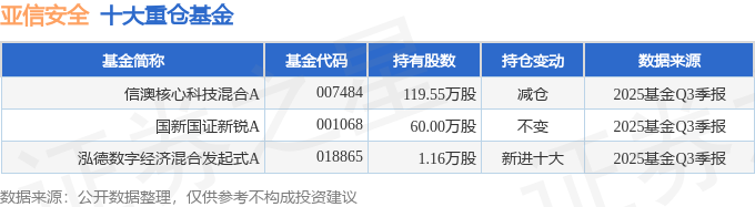 持有亚信安全最多的基金为信澳核心科技混合A,目前规模为6.23亿元,最新净值1.6235(10月29日),较上一交易日下跌0.02%,近一年上涨35.79%。该基金现任基金经理为徐聪。