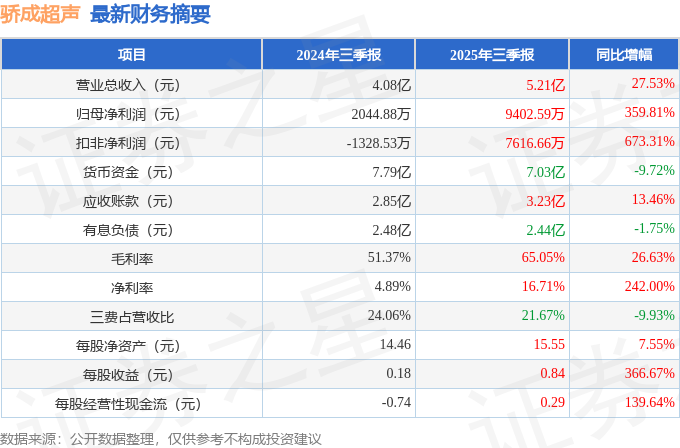 据证券之星公开数据整理,近期骄成超声(688392)发布2025年三季报。截至本报告期末,公司营业总收入5.21亿元,同比上升27.53%,归母净利润9402.59万元,同比上升359.81%。按单季度数据看,第三季度营业总收入1.98亿元,同比上升20.16%,第三季度归母净利润3598.9万元,同比上升136.81%。本报告期骄成超声盈利能力上升,毛利率同比增幅26.63%,净利率同比增幅242%。