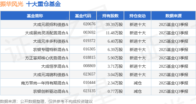 持有振华风光最多的基金为大成元辰招利债券A,目前规模为4.58亿元,最新净值1.0674(10月29日),较上一交易日上涨0.18%,近一年上涨5.78%。该基金现任基金经理为孙丹。
