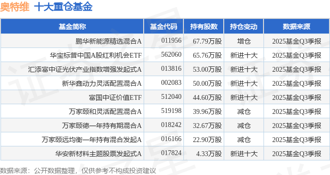 持有奥特维最多的基金为鹏华新能源精选混合A,目前规模为6.07亿元,最新净值1.2187(10月29日),较上一交易日上涨4.08%,近一年上涨37.49%。该基金现任基金经理为张宏钧。