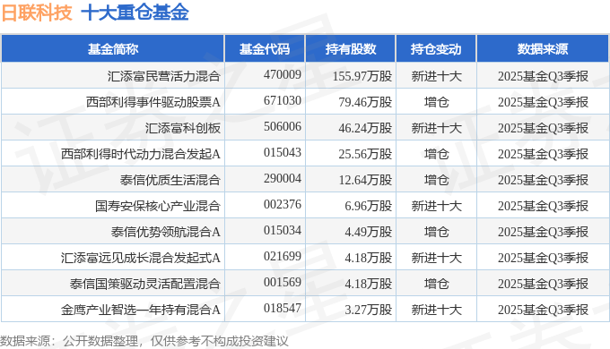 持有日联科技最多的基金为汇添富民营活力混合,目前规模为33.48亿元,最新净值7.088(10月29日),较上一交易日上涨1.8%,近一年上涨61.93%。该基金现任基金经理为马翔。