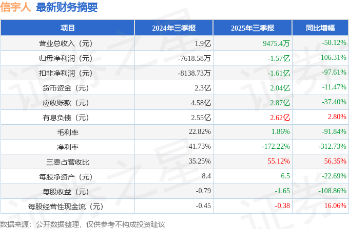 据证券之星公开数据整理,近期信宇人(688573)发布2025年三季报。截至本报告期末,公司营业总收入9475.4万元,同比下降50.12%,归母净利润-1.57亿元,同比下降106.31%。按单季度数据看,第三季度营业总收入827.74万元,同比下降73.38%,第三季度归母净利润-8477.53万元,同比下降150.58%。本报告期信宇人三费占比上升明显,财务费用、销售费用和管理费用总和占总营收同比增幅达112.43%。