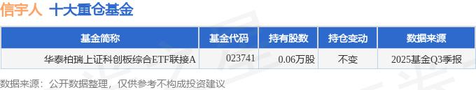 持有信宇人最多的基金为华泰柏瑞上证科创板综合ETF联接A,目前规模为0.4亿元,最新净值1.4141(10月29日),较上一交易日上涨0.84%。该基金现任基金经理为谭弘翔。