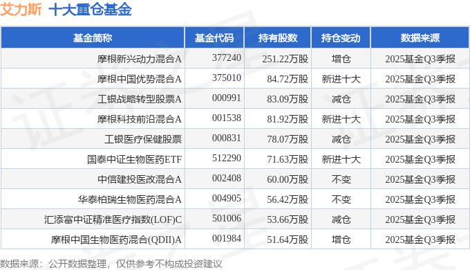 持有艾力斯最多的基金为摩根新兴动力混合A,目前规模为74.96亿元,最新净值9.247(10月29日),较上一交易日上涨2.13%,近一年上涨78.92%。该基金现任基金经理为杜猛。