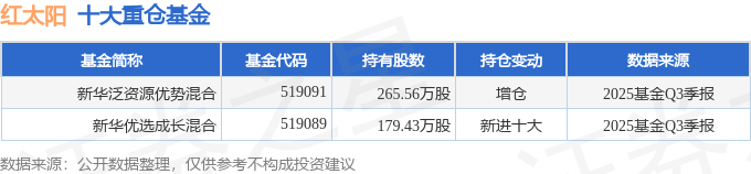 持有红太阳最多的基金为新华泛资源优势混合,目前规模为6.61亿元,最新净值6.3604(10月29日),较上一交易日上涨0.73%,近一年上涨6.54%。该基金现任基金经理为赖庆鑫。