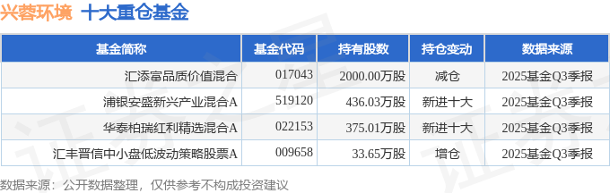 持有兴蓉环境最多的基金为汇添富品质价值混合,目前规模为22.43亿元,最新净值1.3104(10月29日),较上一交易日上涨0.61%,近一年上涨14.52%。该基金现任基金经理为温宇峰。