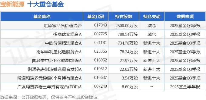 持有宝新能源最多的基金为汇添富品质价值混合,目前规模为22.43亿元,最新净值1.3104(10月29日),较上一交易日上涨0.61%,近一年上涨14.52%。该基金现任基金经理为温宇峰。