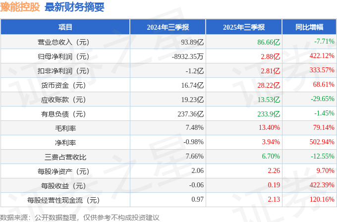 据证券之星公开数据整理,近期豫能控股(001896)发布2025年三季报。截至本报告期末,公司营业总收入86.66亿元,同比下降7.71%,归母净利润2.88亿元,同比上升422.12%。按单季度数据看,第三季度营业总收入33.82亿元,同比上升3.98%,第三季度归母净利润1.85亿元,同比上升497.28%。本报告期豫能控股短期债务压力上升,流动比率达0.51。
