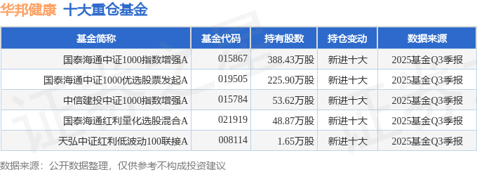 持有华邦健康最多的基金为国泰海通中证1000指数增强A,目前规模为11.28亿元,最新净值1.4751(10月29日),较上一交易日上涨0.92%,近一年上涨43.27%。该基金现任基金经理为胡崇海 刘晟。