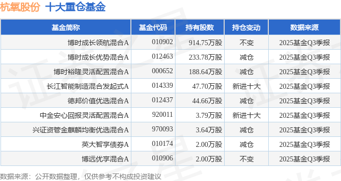 持有杭氧股份最多的基金为博时成长领航混合A,目前规模为33.93亿元,最新净值0.8356(10月29日),较上一交易日上涨0.89%,近一年上涨17.79%。该基金现任基金经理为陈鹏扬 郭康斌。