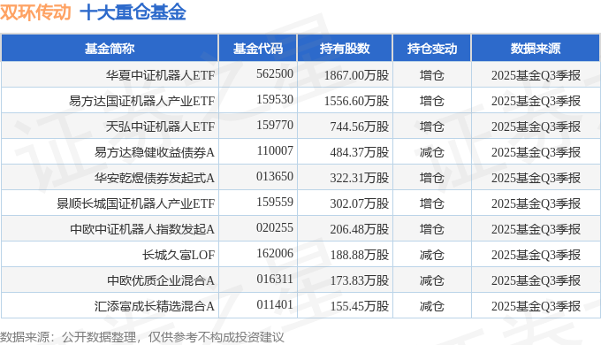 持有双环传动最多的基金为华夏中证机器人ETF,目前规模为227.98亿元,最新净值1.0446(10月29日),较上一交易日上涨1.02%,近一年上涨44.46%。该基金现任基金经理为华龙。
