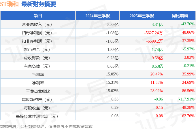 据证券之星公开数据整理,近期ST瑞和(002620)发布2025年三季报。截至本报告期末,公司营业总收入3.31亿元,同比下降43.76%,归母净利润-5627.24万元,同比上升48.06%。按单季度数据看,第三季度营业总收入1.0亿元,同比下降43.18%,第三季度归母净利润-3307.06万元,同比下降28.36%。本报告期ST瑞和三费占比上升明显,财务费用、销售费用和管理费用总和占总营收同比增幅达86.56%。