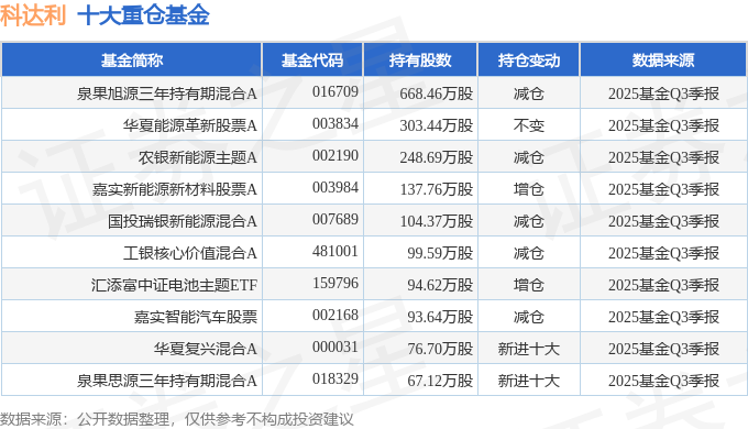 持有科达利最多的基金为泉果旭源三年持有期混合A,目前规模为163.29亿元,最新净值1.1259(10月29日),较上一交易日上涨2.32%,近一年上涨37.46%。该基金现任基金经理为赵诣。