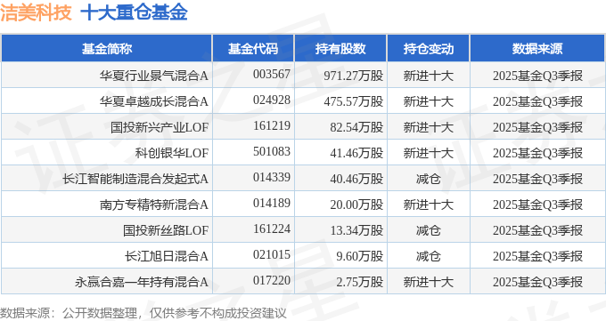 持有洁美科技最多的基金为华夏行业景气混合A,目前规模为89.72亿元,最新净值4.9154(10月29日),较上一交易日上涨1.53%,近一年上涨58.48%。该基金现任基金经理为钟帅。