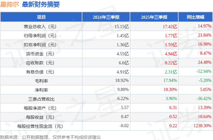 据证券之星公开数据整理,近期星帅尔(002860)发布2025年三季报。截至本报告期末,公司营业总收入17.42亿元,同比上升14.97%,归母净利润1.77亿元,同比上升21.84%。按单季度数据看,第三季度营业总收入6.09亿元,同比上升29.08%,第三季度归母净利润5532.78万元,同比上升4.49%。本报告期星帅尔公司应收账款体量较大,当期应收账款占最新年报归母净利润比达571.89%。