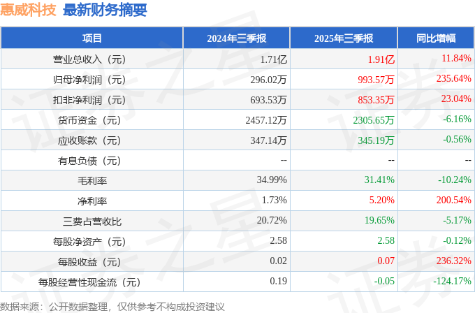 据证券之星公开数据整理,近期惠威科技(002888)发布2025年三季报。根据财报显示,惠威科技营收净利润同比双双增长。截至本报告期末,公司营业总收入1.91亿元,同比上升11.84%,归母净利润993.57万元,同比上升235.64%。按单季度数据看,第三季度营业总收入6408.85万元,同比下降14.36%,第三季度归母净利润112.28万元,同比下降79.86%。
