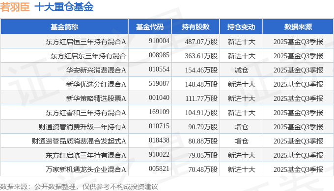 持有若羽臣最多的基金为东方红启恒三年持有混合A,目前规模为7.18亿元,最新净值11.431(10月29日),较上一交易日上涨0.76%,近一年上涨18.31%。该基金现任基金经理为胡晓 李竞。