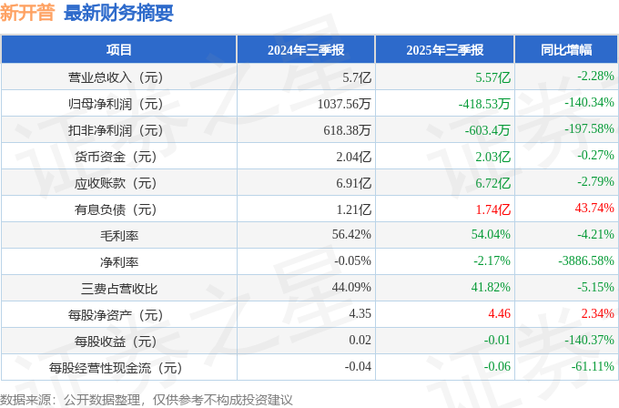 据证券之星公开数据整理,近期新开普(300248)发布2025年三季报。截至本报告期末,公司营业总收入5.57亿元,同比下降2.28%,归母净利润-418.53万元,同比下降140.34%。按单季度数据看,第三季度营业总收入2.42亿元,同比上升4.87%,第三季度归母净利润2698.7万元,同比下降9.13%。本报告期新开普公司应收账款体量较大,当期应收账款占最新年报归母净利润比达609.47%。