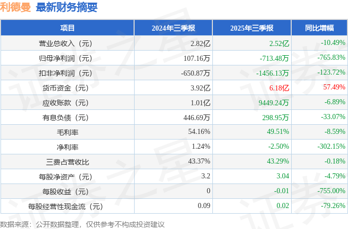 据证券之星公开数据整理,近期利德曼(300289)发布2025年三季报。根据财报显示,利德曼净利润同比下降765.83%。截至本报告期末,公司营业总收入2.52亿元,同比下降10.49%,归母净利润-713.48万元,同比下降765.83%。按单季度数据看,第三季度营业总收入9175.93万元,同比下降1.83%,第三季度归母净利润-288.96万元,同比下降720.79%。