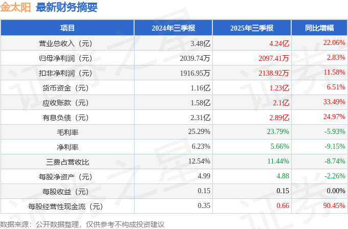 据证券之星公开数据整理,近期金太阳(300606)发布2025年三季报。截至本报告期末,公司营业总收入4.24亿元,同比上升22.06%,归母净利润2097.41万元,同比上升2.83%。按单季度数据看,第三季度营业总收入1.54亿元,同比上升34.76%,第三季度归母净利润626.35万元,同比上升50.2%。本报告期金太阳公司应收账款体量较大,当期应收账款占最新年报营业总收入比达42.71%。