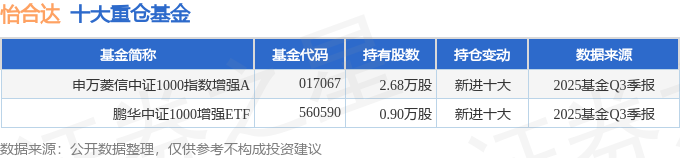 持有怡合达最多的基金为申万菱信中证1000指数增强A,目前规模为0.57亿元,最新净值1.2794(10月29日),较上一交易日上涨0.58%,近一年上涨37.45%。该基金现任基金经理为刘敦 夏祥全。