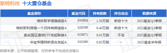 持有联特科技最多的基金为格林聚享增强债券A,目前规模为1.57亿元,最新净值1.1486(10月29日),较上一交易日上涨0.14%,近一年上涨4.58%。该基金现任基金经理为冯翰尊。