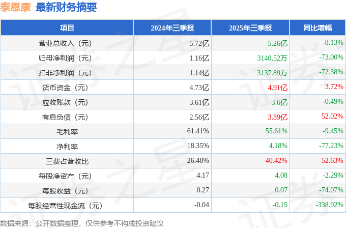 据证券之星公开数据整理,近期泰恩康(301263)发布2025年三季报。截至本报告期末,公司营业总收入5.26亿元,同比下降8.13%,归母净利润3140.52万元,同比下降73.0%。按单季度数据看,第三季度营业总收入1.79亿元,同比上升1.02%,第三季度归母净利润-567.96万元,同比下降118.57%。本报告期泰恩康三费占比上升明显,财务费用、销售费用和管理费用总和占总营收同比增幅达52.63%。