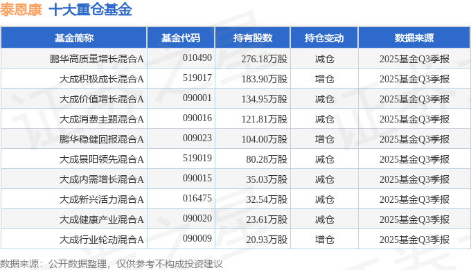 持有泰恩康最多的基金为鹏华高质量增长混合A,目前规模为9.67亿元,最新净值1.1366(10月29日),较上一交易日上涨0.88%,近一年上涨49.57%。该基金现任基金经理为胡颖。