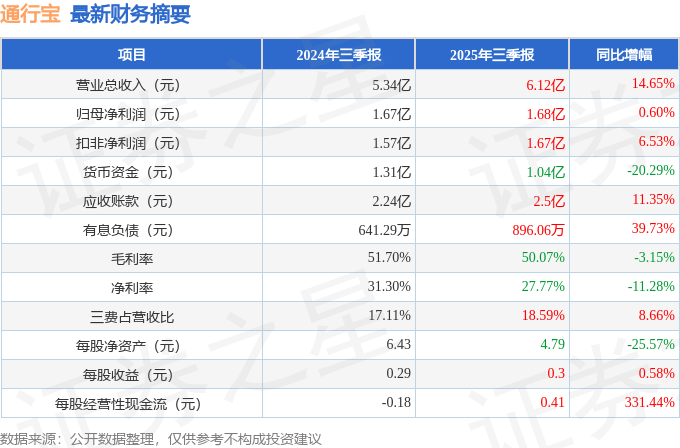 据证券之星公开数据整理,近期通行宝(301339)发布2025年三季报。截至本报告期末,公司营业总收入6.12亿元,同比上升14.65%,归母净利润1.68亿元,同比上升0.6%。按单季度数据看,第三季度营业总收入2.23亿元,同比上升8.31%,第三季度归母净利润6114.02万元,同比上升0.5%。本报告期通行宝公司应收账款体量较大,当期应收账款占最新年报归母净利润比达119.09%。