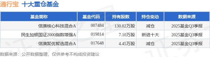 持有通行宝最多的基金为信澳核心科技混合A,目前规模为6.23亿元,最新净值1.6235(10月29日),较上一交易日下跌0.02%,近一年上涨35.79%。该基金现任基金经理为徐聪。