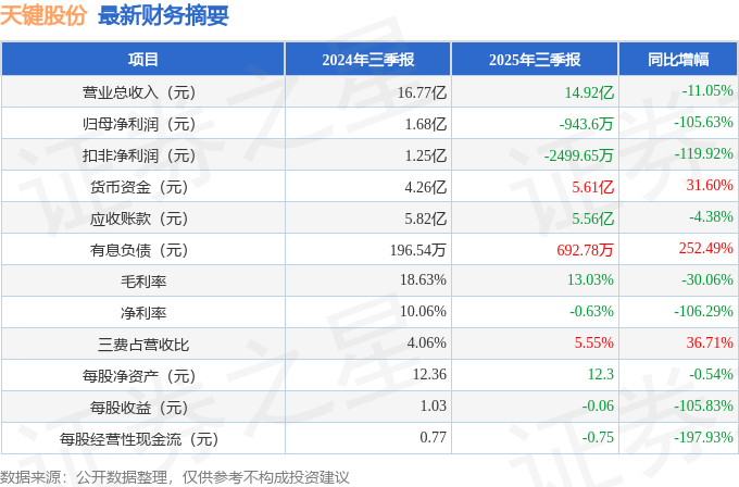 据证券之星公开数据整理,近期天键股份(301383)发布2025年三季报。截至本报告期末,公司营业总收入14.92亿元,同比下降11.05%,归母净利润-943.6万元,同比下降105.63%。按单季度数据看,第三季度营业总收入5.97亿元,同比下降17.31%,第三季度归母净利润-1468.95万元,同比下降120.19%。本报告期天键股份公司应收账款体量较大,当期应收账款占最新年报归母净利润比达262.76%。