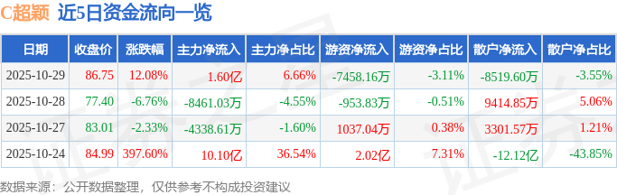 证券之星消息,截至2025年10月29日收盘,C超颖(603175)报收于86.75元,上涨12.08%,换手率64.48%,成交量28.37万手,成交额23.98亿元。